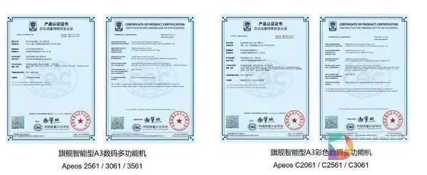 近日,富士胶片商业创新旗舰智能型A3彩色数码多功能机Apeos C3061/C2561/C2061,Apeos C7071/C6571/C5571/C4571/C3571/C3071、旗舰智能型A3数码多功能机Apeos 3561/3061/2561同时获中国质量认证中心(CQC)颁发的"办公设备网络安全认证"。 Apeos系列旗舰智能型A3数码多功能机不仅能实现专业打印品质、设计简约、智能操控、高可扩展性、高可靠性、节能环保等,还可作为一体式集成智能助手实现全方位信息安全、无忧服务、无边界协作并简化工作流程。