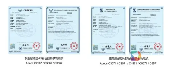 近日,富士胶片商业创新旗舰智能型A3彩色数码多功能机Apeos C3061/C2561/C2061,Apeos C7071/C6571/C5571/C4571/C3571/C3071、旗舰智能型A3数码多功能机Apeos 3561/3061/2561同时获中国质量认证中心(CQC)颁发的"办公设备网络安全认证"。目前,包括此前首批获认证产品Apeos C3567/C3067/C2567在内,Apeos系列智能型数码多功能机全线共19款机型全部达到新版国家标准GB/T 29244-2024《网络安全技术 办公设备安全规范》(增强级),这进一步体现富士胶片商业创新(中国)有限公司在推进全行业加速数字化转型的同时,致力于通过提供具有全方位安全防护的智能型数码多功能设备和AI赋能的网络安全网格解决方案与服务,助力企业构筑全面有效的信息安全防护。