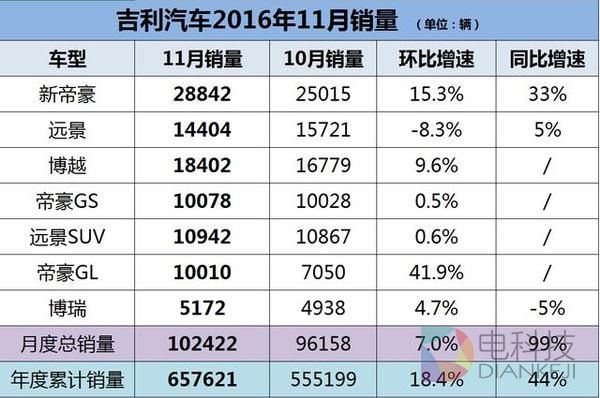 作为自主品牌轿车销冠,新帝豪11月份销量达28842辆,同比增长33%,或将连续两月进入轿车销量榜前十。远景也继续保持了热销态势,11月销量14404辆,同比增长约5%。