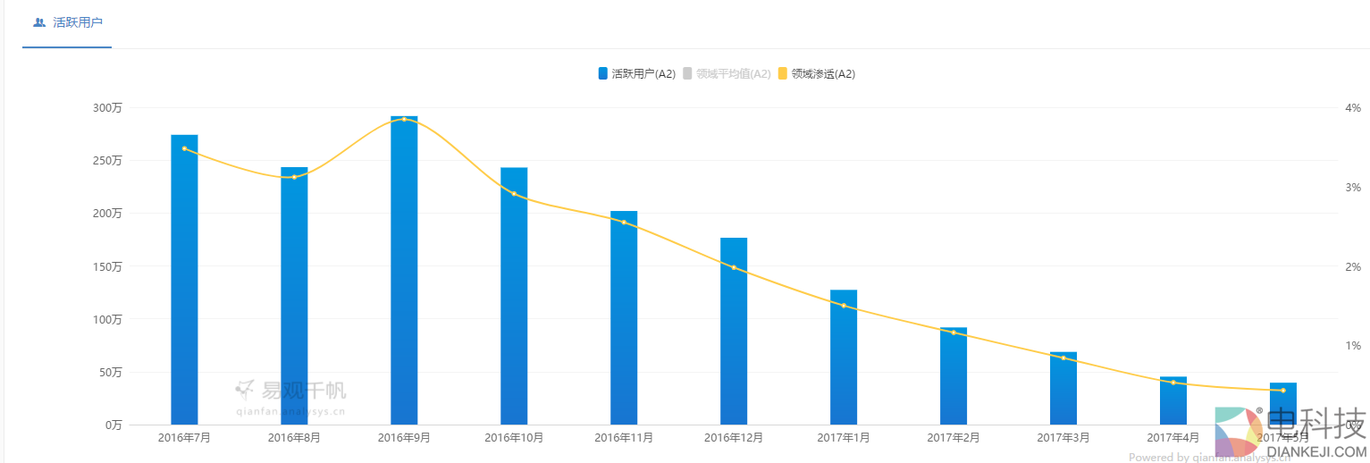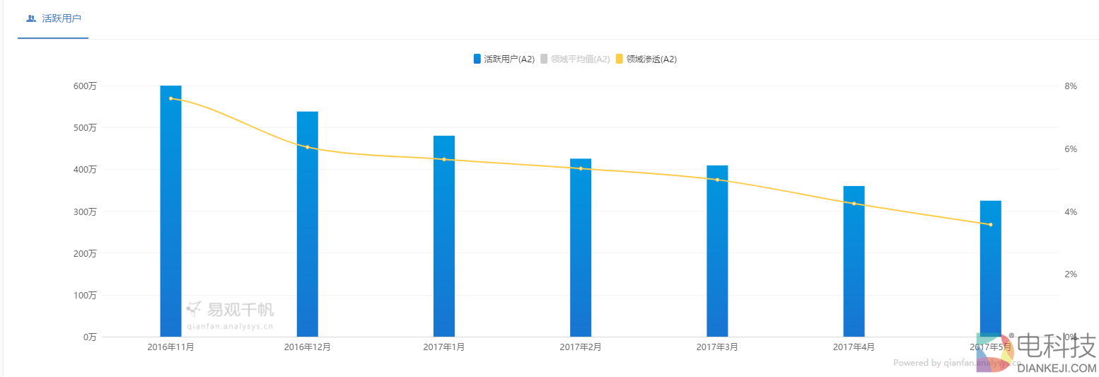 根据易观千帆的监测数据,懂懂笔记发现目前易到客户端的用户活跃度,已经从2016年11月开始连续出现了6个月的下滑。其中,用户月活跃数量已经从去年11月份的600万人,一路下跌至如今的325万人。