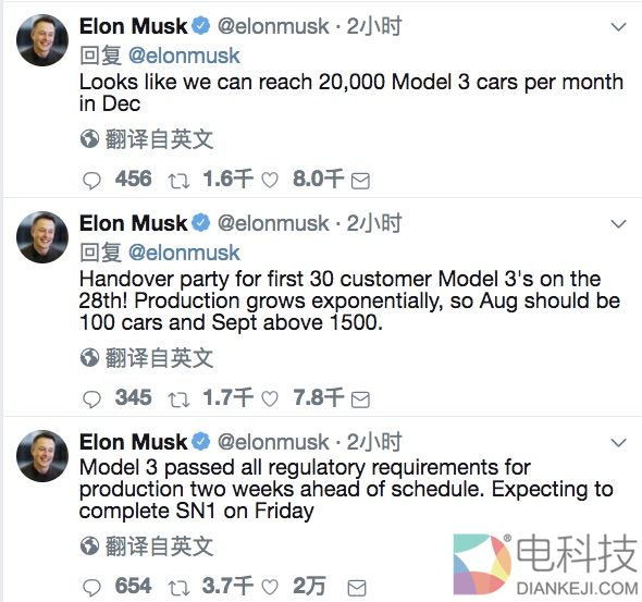 马斯克先是表示,Model 3 比原计划提前两周通过了生产所需的全部监管条例,预计于本周五完成第一辆。随后他又宣布,首批 30 台车会在本月 28 日交付,到下月和下下个月,总产量将分别达 100 台和 1500 台。