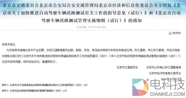 今天,北京市交通委发布了《关于加快推进自动驾驶车辆道路测试有关工作的指导意见(试行)》和《自动驾驶车辆道路测试管理实施细则(试行)》。