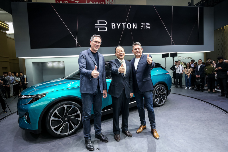 2018北京车展上,宁德时代董事长曾毓群(中),以及两位联合创始人:BYTON拜腾总裁戴雷(左)、 CEO 毕福康(右)