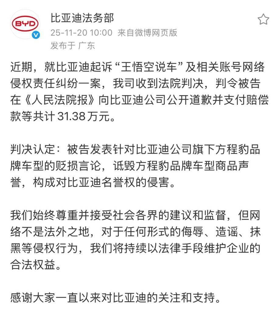 近日,比亚迪起诉自媒体账号“王悟空说车”及相关主体网络侵权责任纠纷一案尘埃落定。11 月 20 日,比亚迪法务部发布公告披露,法院经审理认定,被告发表针对比亚迪旗下方程豹品牌车型的贬损言论,已构成对企业名誉权的侵害,最终判决被告需向比亚迪公开赔礼道歉,并支付共计 31.38 万元赔偿款。
