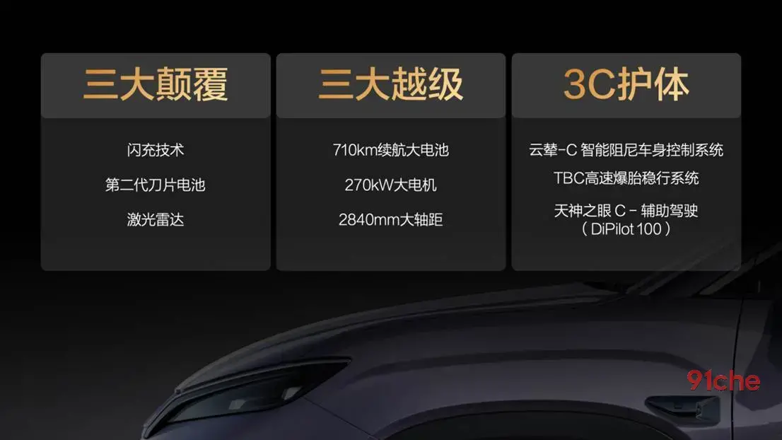 除了“第二代刀片电池、闪充技术及激光雷达”带来的三大颠覆,宋Ultra EV还带来了“三大越级、3C 护体”。宋Ultra EV的电机最大功率为270kW,为多种场景尤其是高速行驶带来了充沛的动力,其最高时速可达210km/h。