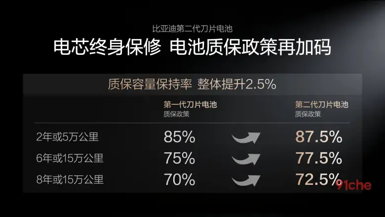 第二代刀片电池通过打造“锂离子高速通道”和“全温域智能热管理系统”,实现了更低的产热和更高效、均匀的散热,让闪充对电池寿命几乎没有影响。基于这样的底气,比亚迪还宣布电池质保政策再加码!第二代刀片电池质保的“容量保持率”整体提升2.5%,电芯依旧是“终身保修”,这就是第二代刀片电池,给所有用户的安心承诺。