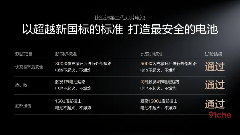 第二代刀片电池继续将安全进行到底,通过一系列超越新国标的安全测试,为用户打造最安全的电池,确保电池全生命周期都安全,彻底打消用户的安全顾虑。