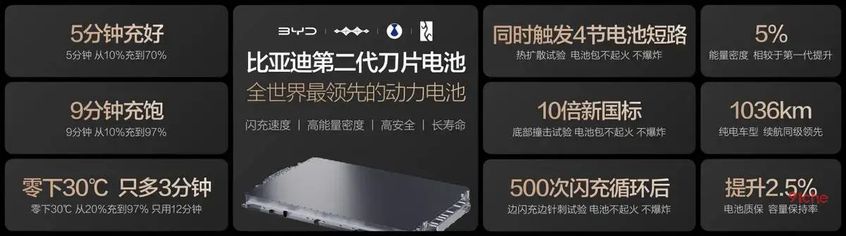 要解决这些根源性问题,关键看电池。六年磨一刀,比亚迪正式推出第二代刀片电池,带来了颠覆性的闪充体验,实现“常温充电,5分钟充好,9分钟充饱;低温充电,零下30度,只多3分钟”,让充电和加油一样快,超越过往,前所未有。