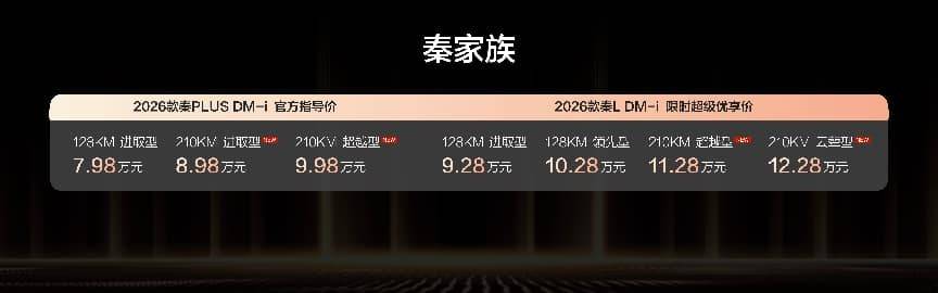 1月8日,比亚迪秦家族迎来重磅加推,2026款秦L DM-i /2026款秦PLUS DM-i 210KM长续航版双车同步上市,售价8.98-12.28万元。其中,2026款秦L DM-i 210KM长续航版限时超级优享价11.28