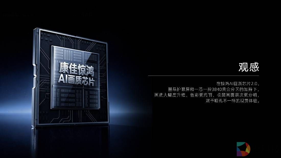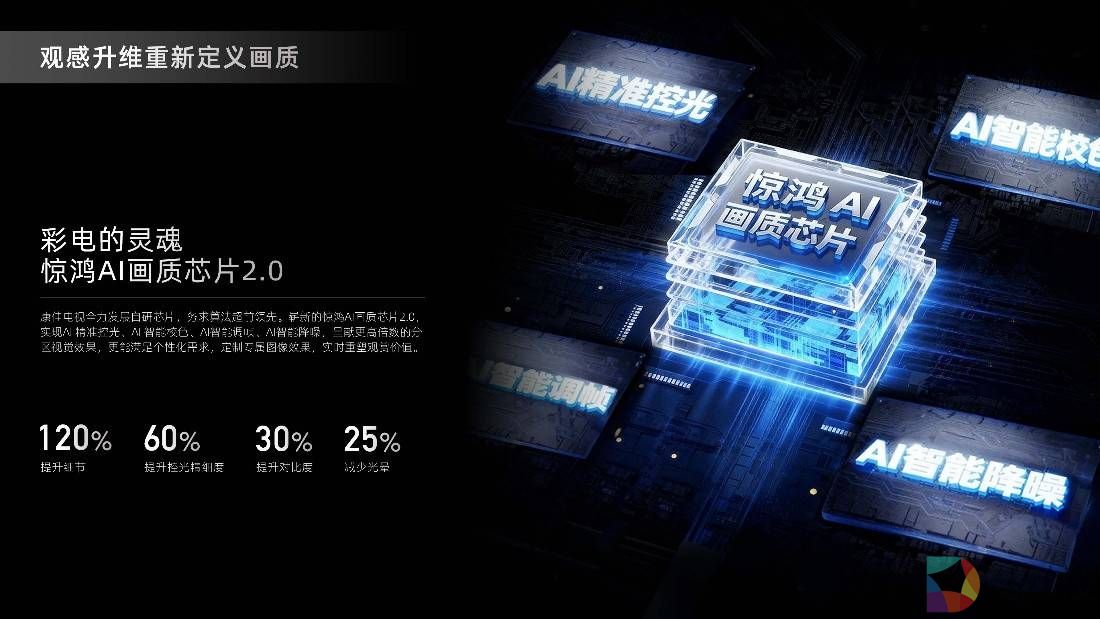 一是惊鸿AI画质芯片2.0,堪称画质优化的“智慧大脑”。作为画质提升的核心引擎,惊鸿AI画质芯片2.0具备四大核心能力:AI精准控光、AI智能校色、AI智能调帧、AI智能降噪。它不仅能呈现更高倍数的分区视觉效果,还可根据用户偏好定制专属图像,实时优化观赏体验。比如老人偏爱更柔和的亮度、孩子观看时自动开启护眼色彩模式、年轻人追综艺时强化色彩饱和度,真正实现“千人千面”的专属画质。经实测,该芯片可实现细节提升120%、控光精细度提升60%、对比度提升30%、光晕减少25%,让画质优势量化可见。