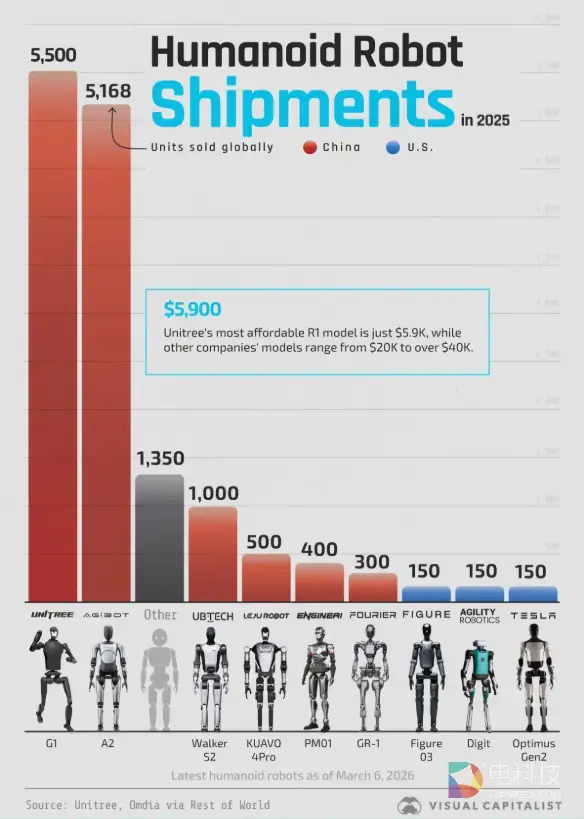 从企业出货量份额来看,中国企业表现突出。根据中国电子报发布的《2025年人形机器人市场研究报告》,宇树科技(Unitree)出货量和市场份额在全球排名第一,2025年出货量超过5500台。此外,宇树科技的产品在技术上也位居世界前列,价格也相对亲民。例如,其最便宜的R1型号售价仅为5900美元,而该公司还出售售价1600美元的机器狗。