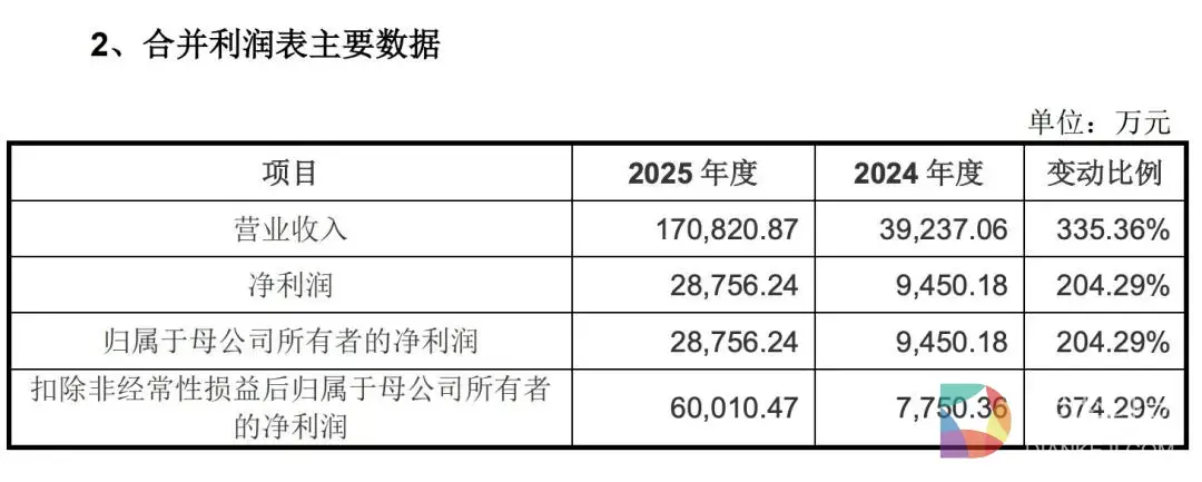 宇树科技披露的招股说明书显示,2025年,宇树科技实现营业收入17.08亿元,同比增长335.36%;实现扣非净利润超6亿元,同比增长674.29%,主要原因为当期产品销量快速增长。