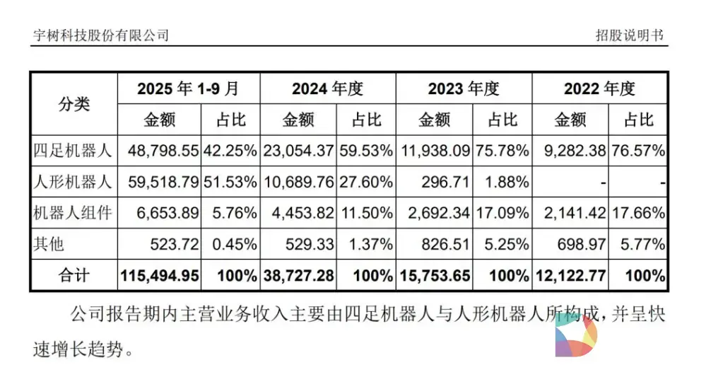 报告期内,宇树科技主营业务收入由四足机器人与人形机器人所构成。2022年、2023年、2024年以及2025年1—9月,四足机器人收入占比逐步下降,从76.57%降至42.25%,人形机器人收入占比逐步提升,从2023年占比1.88%,到2025年1—9月达到51.53%。