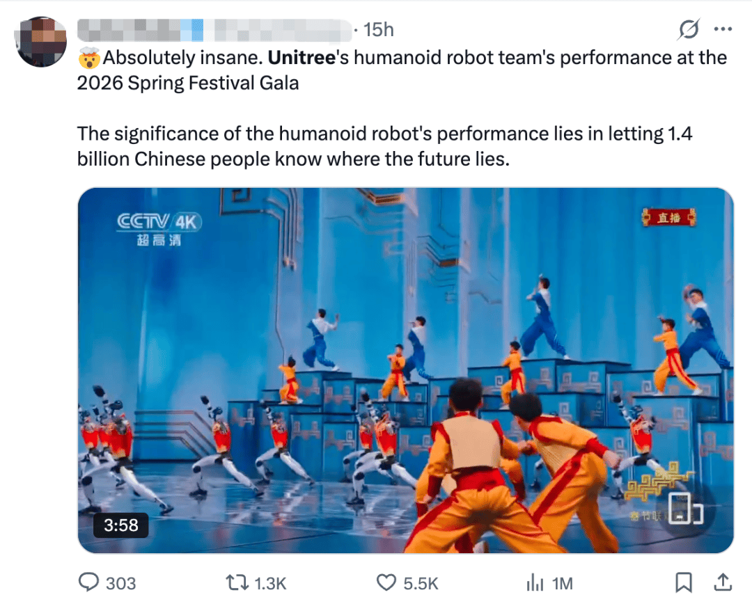 ▲宇树机器人武术表演在海外社交平台X上爆火