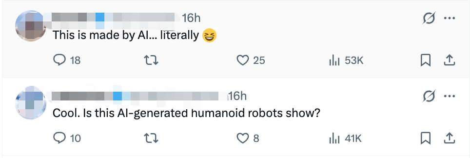 推文的评论区充斥着惊叹与难以置信:“这是AI生成的吗?”“这些是不是人假扮的?”“为什么美国那些耗资数十亿美元的研究实验室花了十多年时间才做到的事,宇树只用了其中一小部分资金就做到了?”