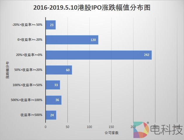 2016年至2019年5月10日,港股IPO总计538家,其中破发143家,破发率26.5%,这意味着打新上涨率也超过7成,另外可以看到的是涨幅超过20%有153家,接近3成,表现相当不错。