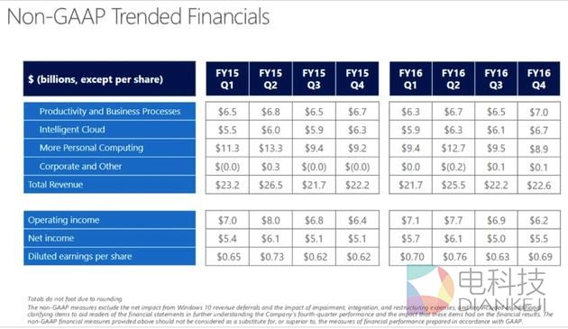依照非GAAP标准主要是为了衡量主要业务的持续经营状况,华尔街分析师的业绩预期也是按照这个指标。依据微软投资者关系部的解释,当季的GAAP业绩还包括了微软对手机业务进行的裁员重组以及Windows 10递延收入的影响。如果依照GAAP标准,微软当季营收206亿美元,每股收益39美分。而上年同期营收220亿美元,每股亏损40美分。上年同期微软计入了75亿美元冲销诺基亚资产的支出,导致当季巨亏32亿美元。