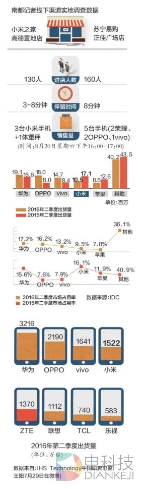 即便按照周末客流最高峰计算,每天开店10小时,小米之家每日的平均客流量也仅在1300人左右,远未达到林斌的预期。而在同一时间,南都记者监测苏宁易购正佳广场门店,其人流量160人,总共卖出2台荣耀、2台OPPO以及1台Vivo。