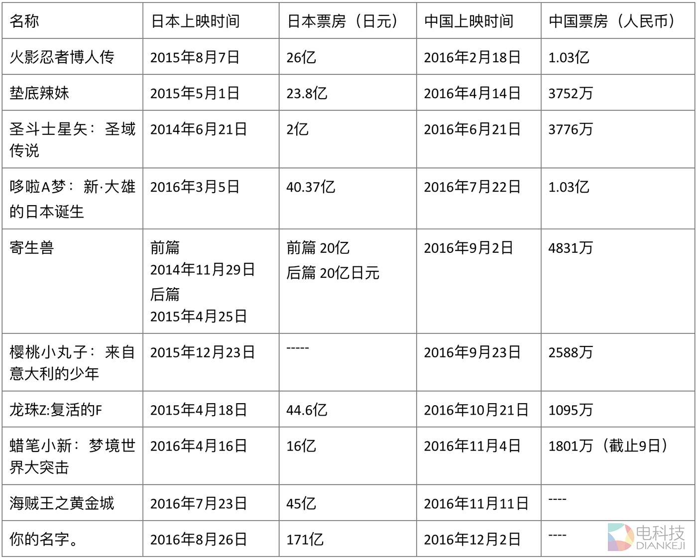 另外3部虽不是日本国民动漫IP,但都有各自的卖点:《垫底辣妹》早前盗版资源流入国内,在网络上播出后励志剧情受到了大批年轻网友追捧;《寄生兽》由知名漫画改编,属于18禁漫改真人电影;《你的名字。》是今年最热的日本动画电影。