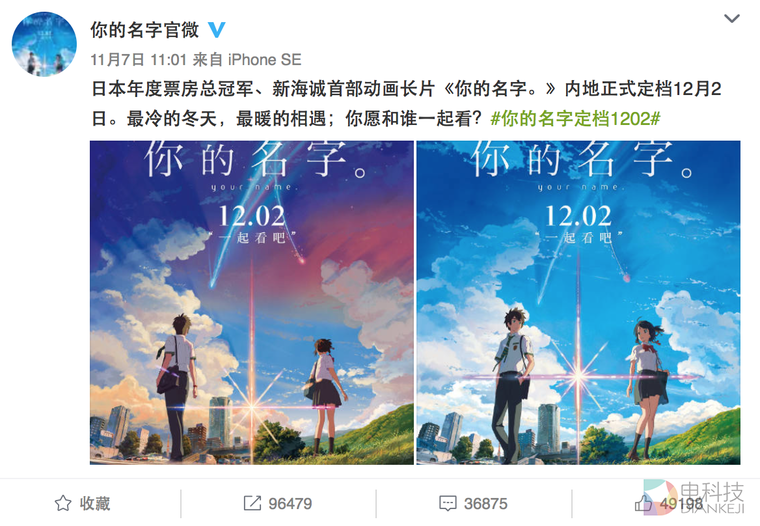 《你的名字。》定档的微博,仅在官微账号就有9.6万次转发