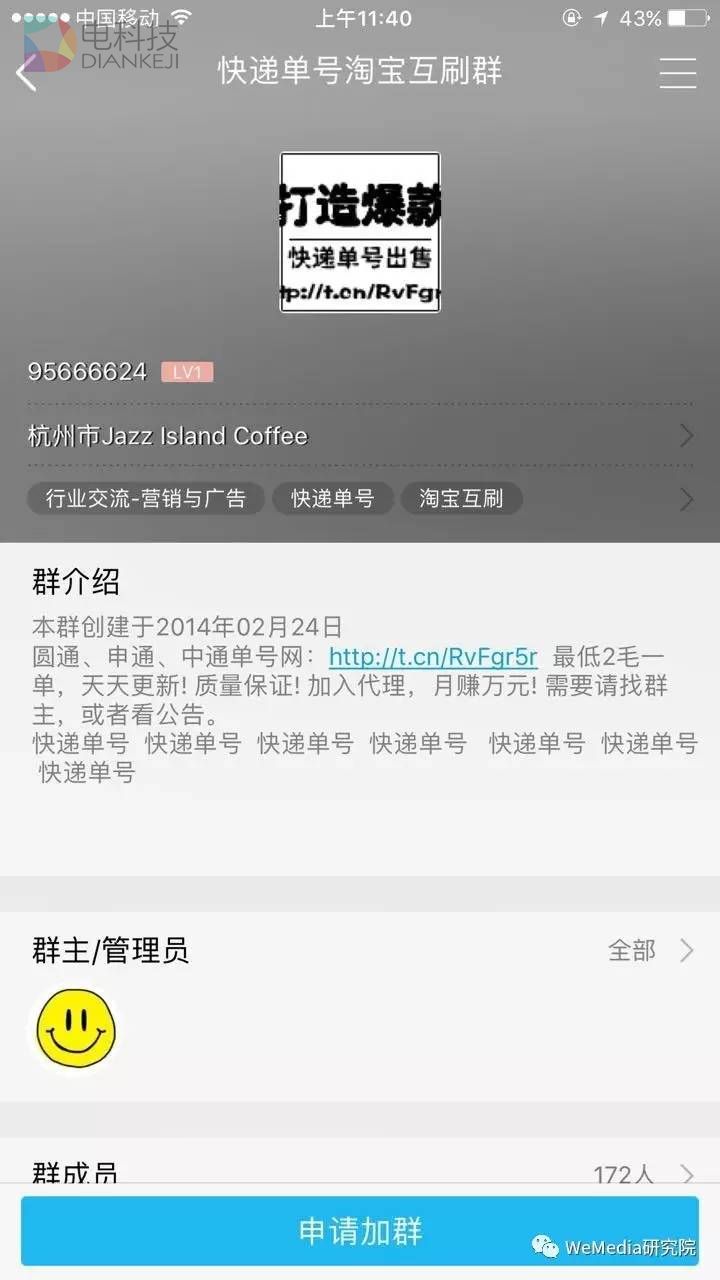QQ群搜索“买卖快递单号”出现几十个活跃的群。