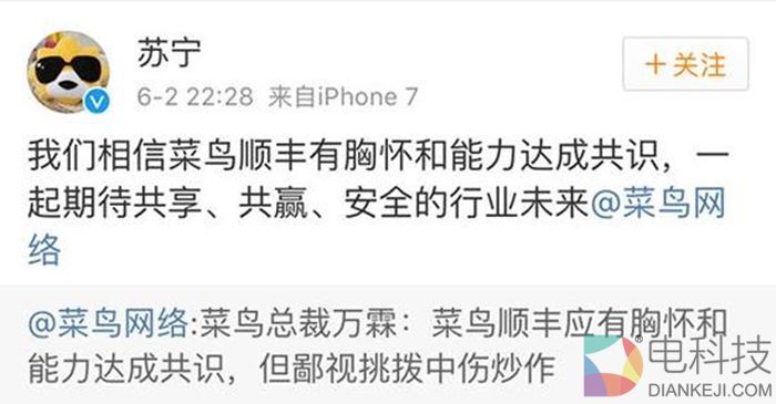 6月3日凌晨,国家邮政局发布消息称,菜鸟、顺丰同意从6月3日12时起,全面恢复业务合作和数据传输。