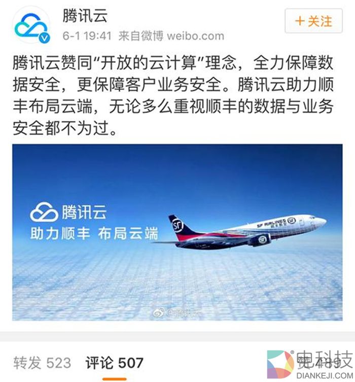 6月1日傍晚,腾讯云微博发声力挺顺丰。
