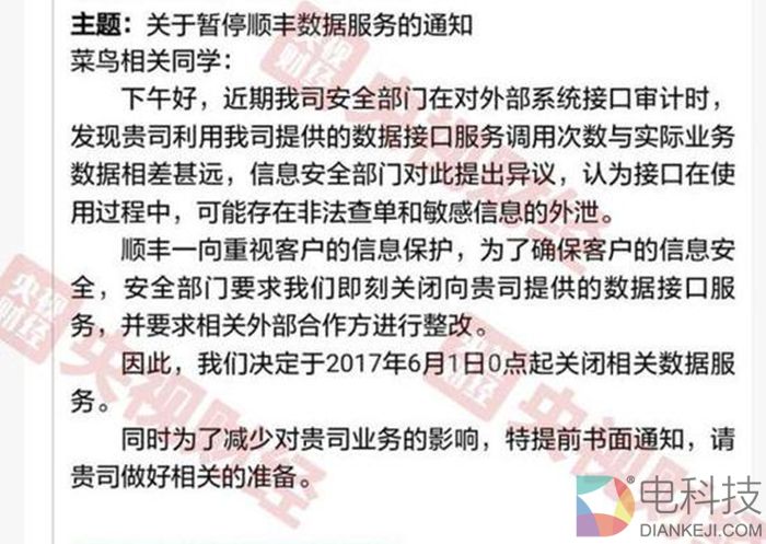 5月31日18时左右,顺丰以邮件的方式通知菜鸟将关闭相关数据服务。