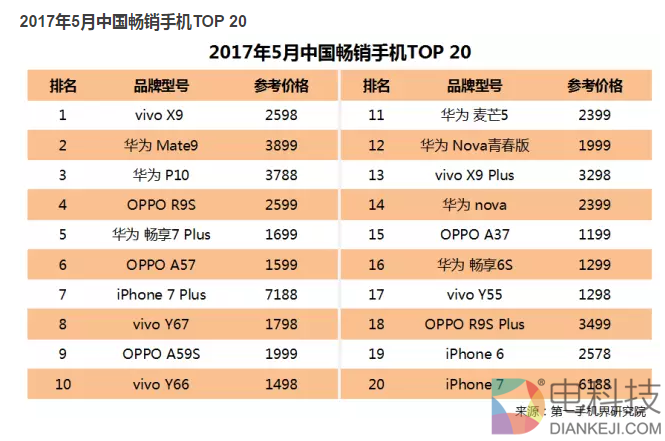 如果聚焦5月份畅销手机TOP 10,就会发现vivo、华为和OPPO机型之丰富:包括了vivo X9、华为 Mate9、华为P10、OPPO R9S、华为畅享7 Plus、OPPO A57、iPhone 7 Plus、vivo Y67、OPPO A59S、vivoY66。如果扩大到畅销手机TOP 20,懂懂笔记统计出华为有 7款,vivo有 5款,OPPO也是 5款,而苹果为3款。简言之就是“幸好多、占便宜!”