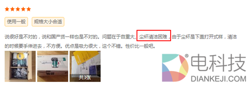 对于吸尘器而言,用户在购买时优先考虑的不仅是其是否具有较大的吸力,使用后的清洁问题也同样值得关注。据了解,戴森V6手持吸尘器使用的是集尘桶收纳污垢,其宣传网页上称“按下按钮即可清洁尘垢,无需直接接触尘垢”。看似很便利的功能设计,在使用过程中却并非这么回事:“灰尘会卡在缝隙处,到时候就只能将整个容器拆下来”、“清洁时必须配上刷子,这点很讨厌”。有的消费者精辟地总结:集尘桶能起到的只是最基本的集中灰尘作用,大家还是要自己动手才能丰衣足食。