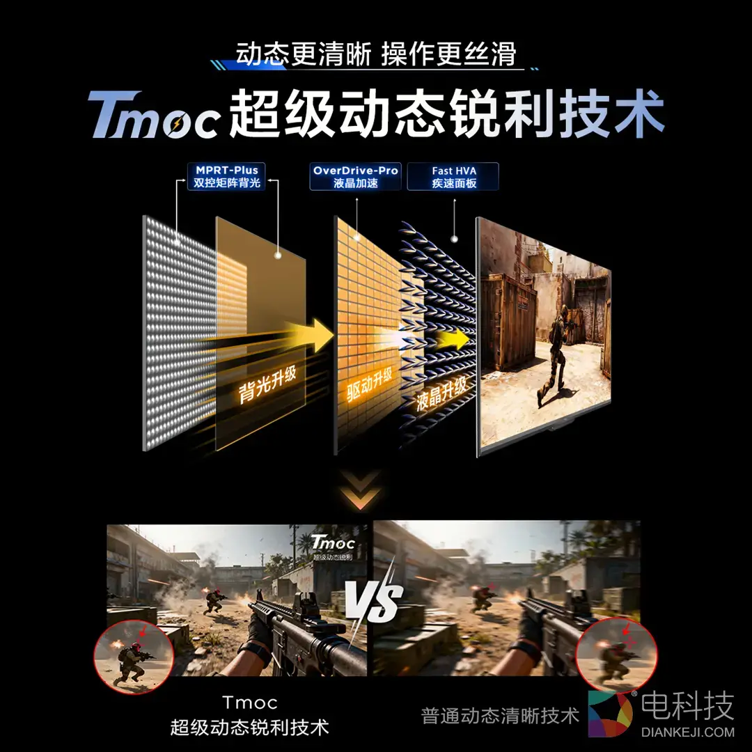 针对高刷与画质难以兼得的行业难题,TCL以“Tmoc超级动态锐利技术”给出答案。HFS Shoot面板通过光配向工艺提升像素响应同步性,确保4K 165Hz下画面依旧清晰;OD Pro液晶加速精控以更高电压驱动液晶并优化过冲,消除鬼影;MPRT-Plus双控矩阵背光分区逐行调节,实现0.2ms MPRT疾速响应且无亮度损失。实战FPS游戏中,拉枪、切镜时敌人轮廓锐利无拖影,定位更精准。
