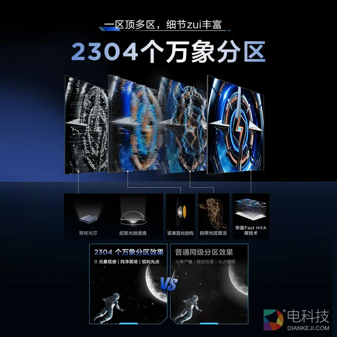 首先来说Mini LED技术。很多品牌为了把分区数作为吸引消费的高光卖点,但实际对分区之外的控光体验几乎是0优化,既没有配套的微透镜、混光结构和自研光控算法,更别提控光技术的全链路优化最终导致,光晕控制一塌糊涂。