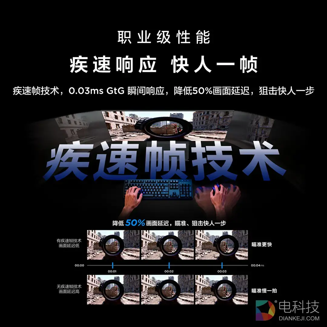 而在FPS游戏场景下,TCL用自研的「疾速帧」技术,补全了传统 OLED高延迟这一块最后的短板,实现了信源处理与画面显示的同步完成,直接将画面延迟降低50%。