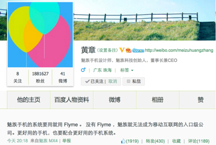 前些日子由于阿里YunOS单方面做MX4YunOS纯净版的适配,魅族通过CPU签名进行了封锁,致使双方合作破灭,魅族副总裁李楠微博上更是与YunOS首席架构师潘爱民打起嘴仗。今日,黄章终于忍不住微博发言“魅族手机的系统要用就用Flyme”,这位极客产品经理,对于公司战略思路越发清晰,简短的言语中间包含了魅族勃勃的野心。