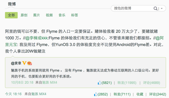 魅族与阿里YunOS双方关于谁家系统体验更好的赌局再次升温,魅族创始人黄章表示“阿里的钱可以不要,但 Flyme 的入口一定要保证。赌体验我看20 万太少了,要赌就赌 1000 万“,话里观点明确,其中传达了不少为人不知信息。