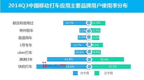 根据调查显示,“六个月”使用率,1号专车与Uber分别占比12.7%、10.6%,成为目前国内商务专车领域典范。专家认为,拥有更清晰的商业模式专车市场是当下打车应用必争之地。尽管目前分别拥有BAT背景的Uber、快的和滴滴尽管都表现得粮草充足,但滴滴专车处争议,Uber使用率仍低于1号专车,就当下而言快的在专车市场显尽优势。
