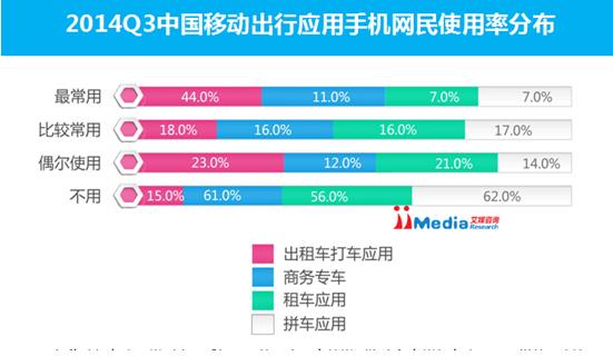 iiMedia Research(艾媒咨询)数据显示,目前在各移动打车应用类型中,商务专车类移动打车应用已经获得一定的用户群体,最常使用占比11%,经常使用占比16%。
