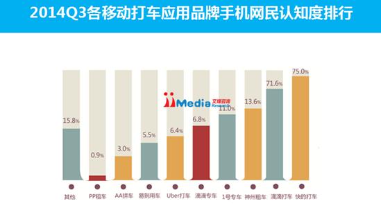 一直隔岸观火的百度也投资美国打车软件鼻祖Uber加入主战场。但有调查显示,今年前三季度,快的和滴滴在内地市场的份额已经分别占到54.4%和44.9%。同时,iiMedia Research(艾媒咨询)数据显示,目前中国手机网民认知度方面,快的打车与滴滴打车变现最为突出,快的打车以75.0%的高认知度居于榜首。