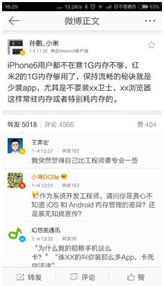 从网友的讨论中,我们可以看到,要保持安卓手机流畅,少装APP可能真有用,不过iPhone6是否流畅与红米手机1GB内存卡不卡是没有半个F码的关系的。孙鹏的说法并站不稳脚跟,显然小米已经在自己曾经最擅长的千元机领域被对手打乱了阵脚。运存越大,自然运行更流畅,要求用户少装APP来保持流畅明显不是这么大的手机厂商所该做的事。