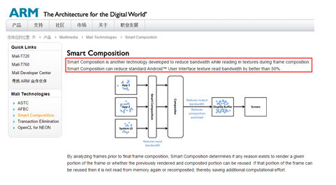 这次MT6752的GPU采用了ARM自家最新的Mali-T760,新增的smart composition功能,可以减少高达50%不必要的带宽合成浪费。这种合成技术,在生成每一帧画面的时候,并不是每次都合成所有的图层,而是把图层分块,检测那些没有变化的图层就不重新生成,有变化的才重新生成,不会一帧一帧重新画,而是把两帧里有变化的地方重新画,其他的地方保持不变。这样就能够把带宽浪费给减下来,让尽可能少的带宽发挥更大的作用。
