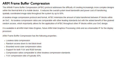 这两项技术使得带宽需求减少许多,按照ARM官网说的最多可以减少50%,那就是一百万像素只需要2.4GB/s的带宽,但是肯定不可能永远是理想状况,一般是3.2GB/s,两百万像素的1080P屏幕对应6.4GB/s,带宽是足够的。