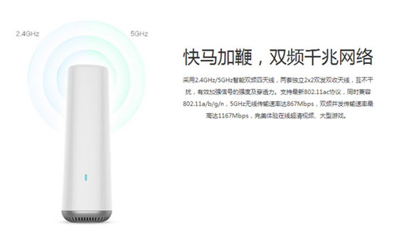 酷开智能无线路由器采用2.4GHz/5GHz智能双频四天线,两套独立2×2双发双收天线,互不干扰,有效加强信号的强度及穿透力。同时支持最新802.11ac协议,兼容802.11a/b/g/n,5GHz无线传输速率达867Mbps,双频并发传输速率最高达1167Mbps,完美体验在线超清视频、大型游戏。