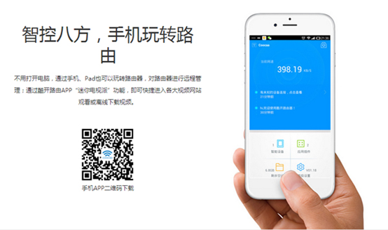 不用打开电脑,通过手机、Pad也可以玩转酷开智能无线路由器,对路由器进行远程管理;通过酷开路由APP“迷你电视派”功能,即可快捷进入各大视频网站观看或离线下载视频。