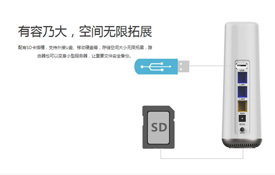 酷开智能无线路由器配有SD卡插槽,支持外接U盘、移动硬盘等,存储空间大小无限拓展,路由器也可以变身小型服务器,让重要文件安全备份。