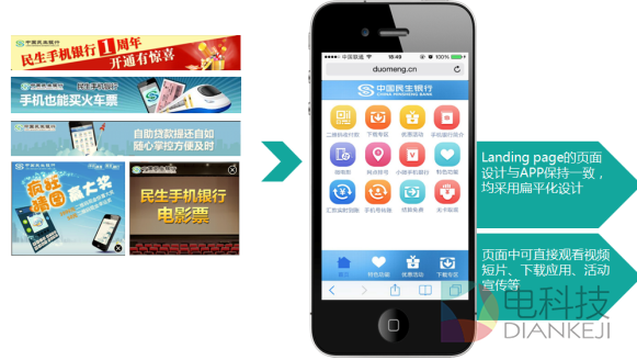 在《中国民生银行手机银行移动端推广》案例中,多盟根据用户使用习惯和兴趣需求,分析用户日常使用APP行为,挑选以上目标客户集中使用的客户端进行投放。并根据客户的产品特点,结合时下最火的游戏形式、制作多个互动活动,通过活动吸引用户关注产品进行后台数据对接,实时进行效果优化,还通过老用户和新用户的分析,根据新老客户的不同,展现不同的广告,从而实现品牌的大量曝光,达到用户的精准覆盖,。