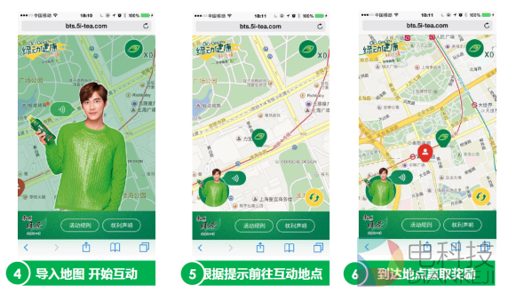 因而,多盟为康师傅绿茶进一步策划了以健步行走换取绿茶饮品的互动方式,用户通过点击投放于APP之上的广告进入互动页面,页面内出现地图,用户按照路线指引,步行到达指定的互动地点,即可赢取奖励。全程互动页面以绿色为主调,传递清新健康的感觉,李易峰形象作为指引大使,通过语音引导用户参与活动,亲和力倍增。
