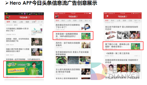 借以其已覆盖的160000+优质APP资源,多盟从中精准地筛选出学生人群日常最喜爱的热门APP进行广告展示;如:在今日头条里的信息流广告创意,游戏应用Pop star里的创意Banner,以及水果忍者中,以“李易峰“为主形象的插屏广告,而通过四年来积累的海量人群数据经验,多盟还可以通过技术定向到学生群体,在选取有效平台之后,进一步精准锁定平台之上的目标人群,并以兴趣为引导,潜移默化地达到眼球共振,并在此基础上激发情感共鸣。