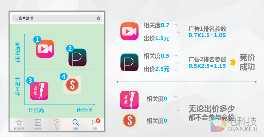 由于苹果一如既往的强调用户体验,本次所引入的竞价机制仅针对搜索广告适用,而免费榜、付费榜、畅销榜、热门搜索、联想词等均不受影响;除广告位之外,其余App展示仍按原有规则进行排序。尤为重要的是,如果与搜索词不相关,无论出价多少都不会被显示。