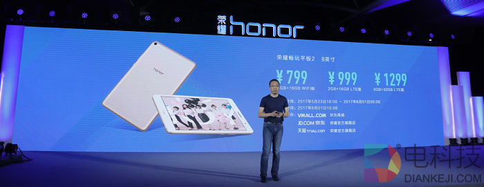 荣耀畅玩平板2 8英寸2GB+16BGB(WI-FI)标配版,售价为799元;8英寸2GB+16GB(LTE)标配版,售价为999元;8英寸3GB+32GB(LTE)高配版,售价为1299元。