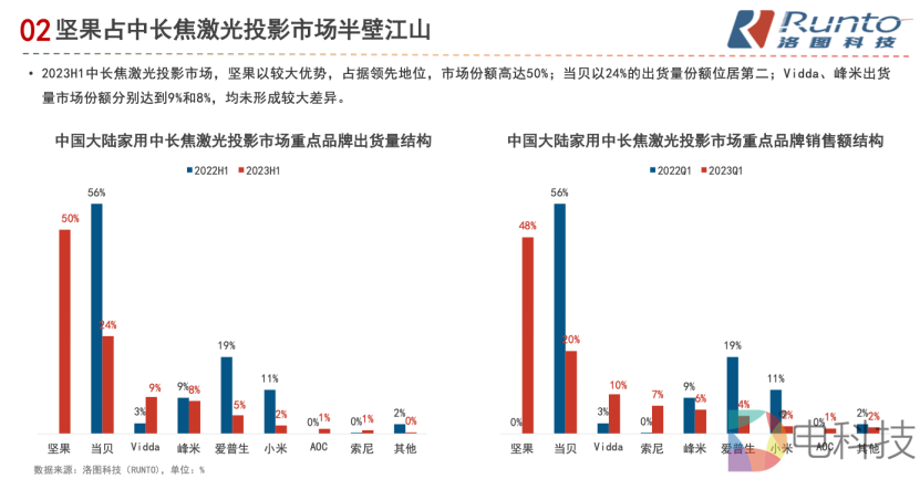 根据洛图科技的数据显示,2023 年上半年坚果在中长焦激光投影市场中,占据领先地位,市场份额高达 50%。这意味着坚果投影仅用了半年时间,就在中长焦激光投影市场中做到了 0 到 50% 的跨越式提升。